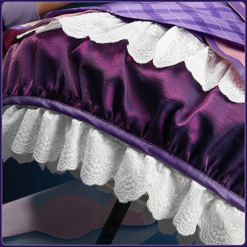 光沢布とポリウレタンで製作しています。ふんわりとフリルが重なった愛らしいデザインで、パープル系の複数のトーンが重ねられ、華やかな色合いを演出しています。