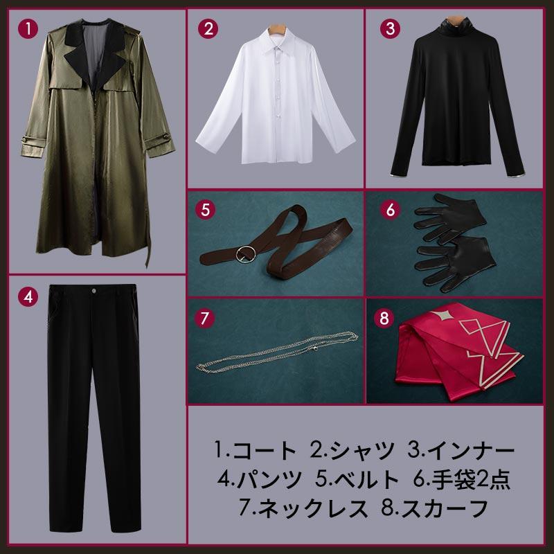 コート、シャツ、インナー、パンツ、飾り物(ベルト、手袋2点、ネックレス、スカーフ)
