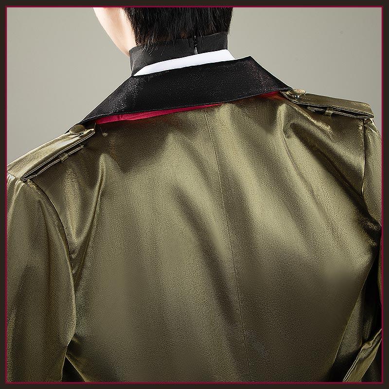光沢布で製作しています。生地は厚みのあるサテン調で、光の角度によって妖しく輝きます。襟は黒地で切り替えられ、裏地と内側のスカーフ部分は鮮烈なワインレッド。背面には深いセンターベント+ベルトと、クラシックな軍服トレンチをベースにしながらも劇的にドラマティックに仕立てたデザインです。