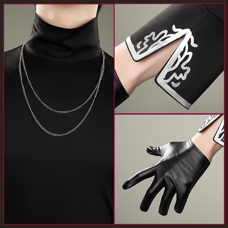 ニット生地で製作しています。首筋のラインを美しく見せつつ神秘的な印象を強化、袖口には銀の刺繍で炎のような模様が入り、わずかに覗かせるとアクセントになります。