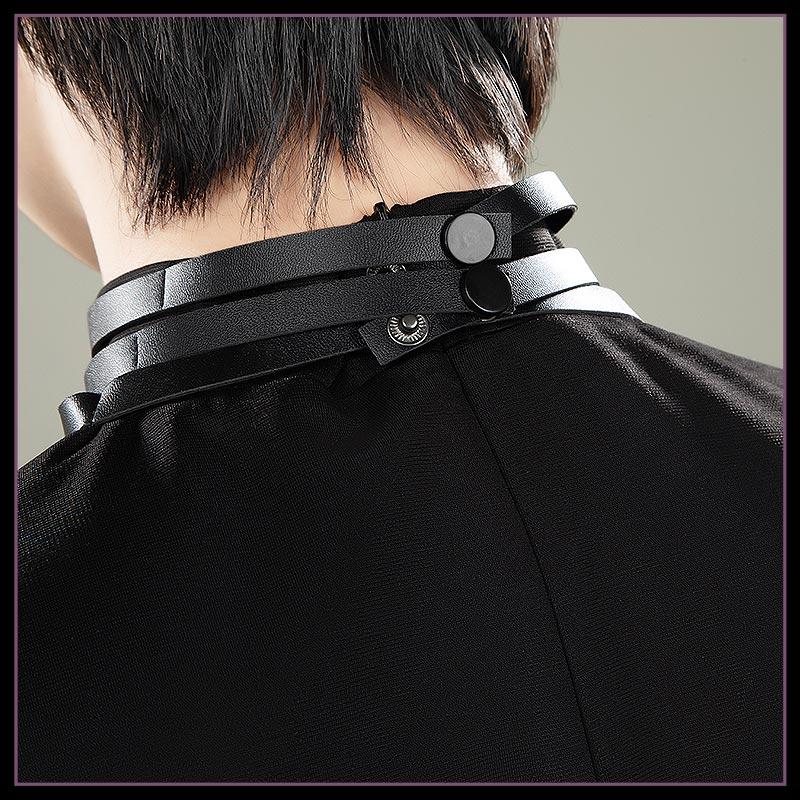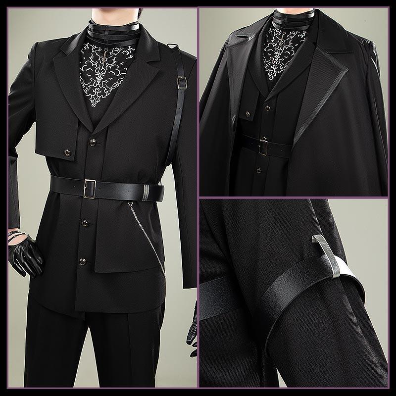 TRサージで製作しています。クラシックなテーラードジャケットをベースに、ゴシック調のエッジを効かせたデザインです。フロントにはアシンメトリーなラペルと、金属製のスナップボタンが配置されています。