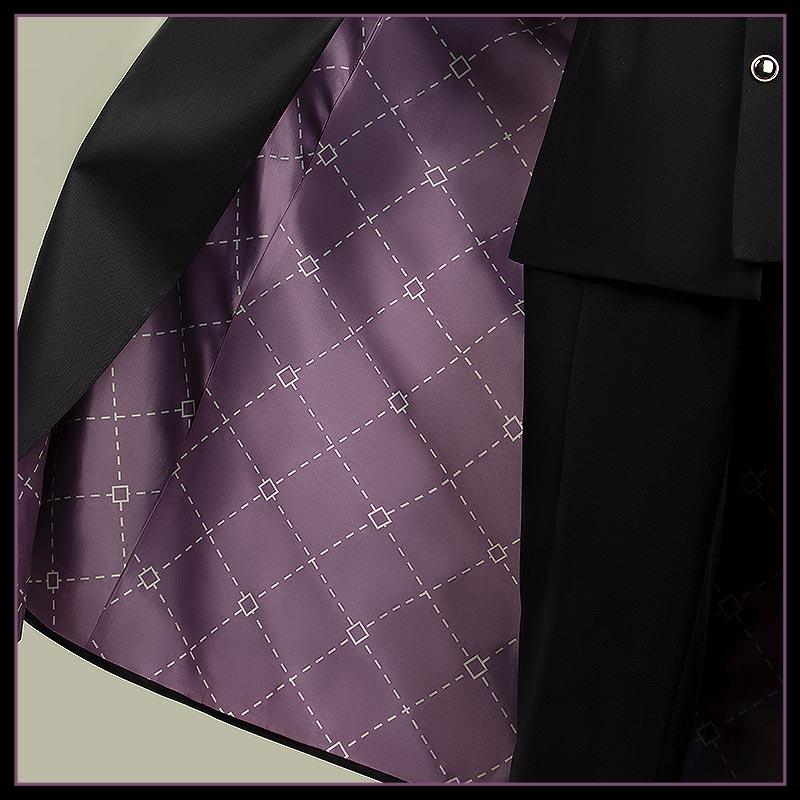 ポリエステルギャバで製作しています。。裏地はパープル調の格子柄プリントが施され、内側から覗くコントラストがアクセント。