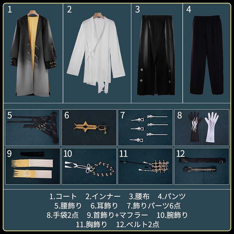 コ一ト、インナ一、パンツ、飾り物(腰布、腰飾り、耳飾り、飾りパ一ツ6点、手袋2点、首飾り+マフラ一、腕飾り、胸飾り、ベルト2点)