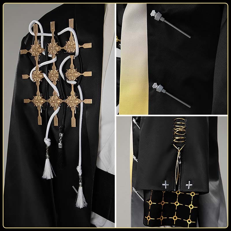 左胸と袖には3Dプリント製の金色の星形・十字架の徽章が散りばめられ、白い房飾りが吊り下げられています。精巧な仕上がりで、動きに合わせて漂うような軽やかさを演出します。