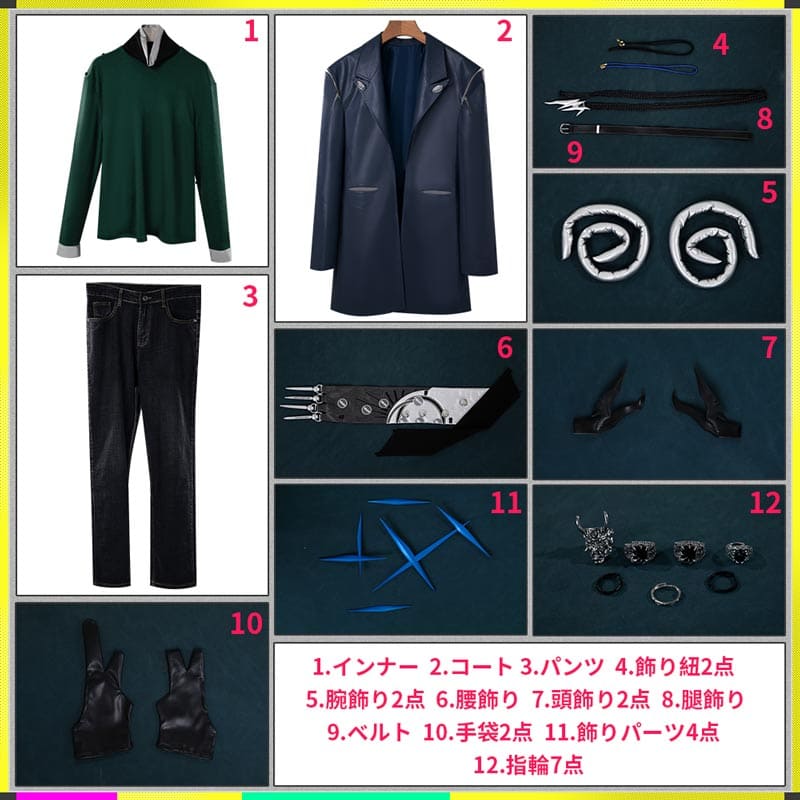 インナ一、コ一ト、パンツ、飾り物(飾り紐2点、腕飾り2点、腰飾り、頭飾り2点、腿飾り、ベルト、手袋2点、飾りパ一ツ4点、指輪7点)