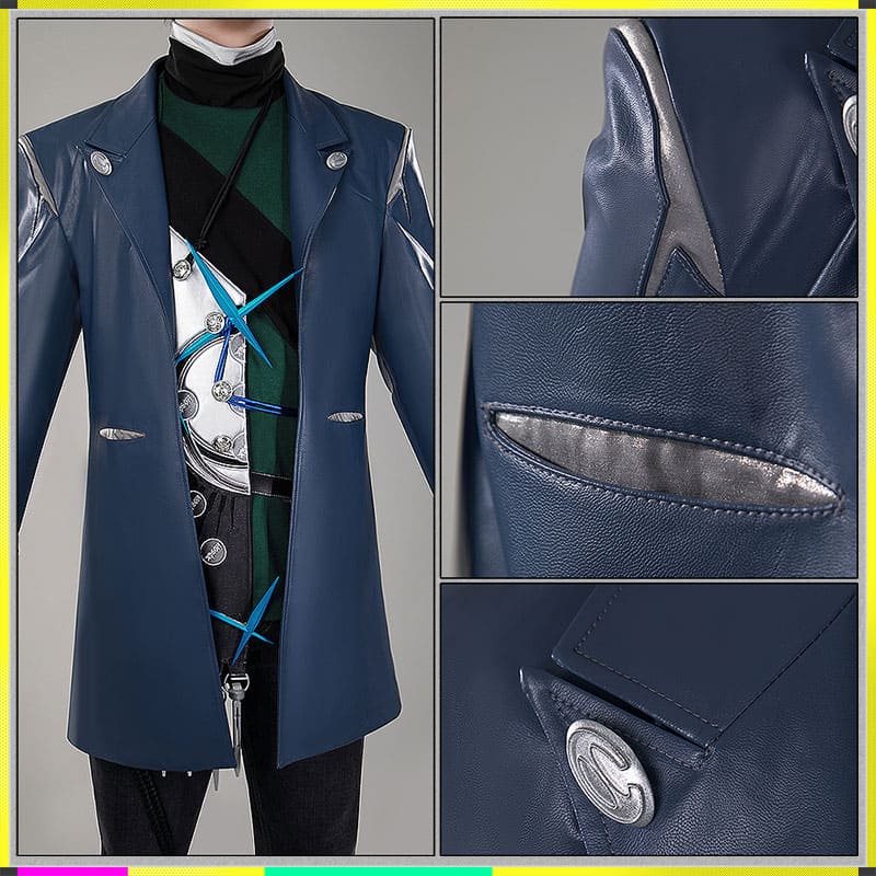 ウォッシュドレザーで製作しています。濃紺のロングコートは、繊細なテクスチャーを持つフェイクレザー素材を使用しており、重厚感と高級感があります。