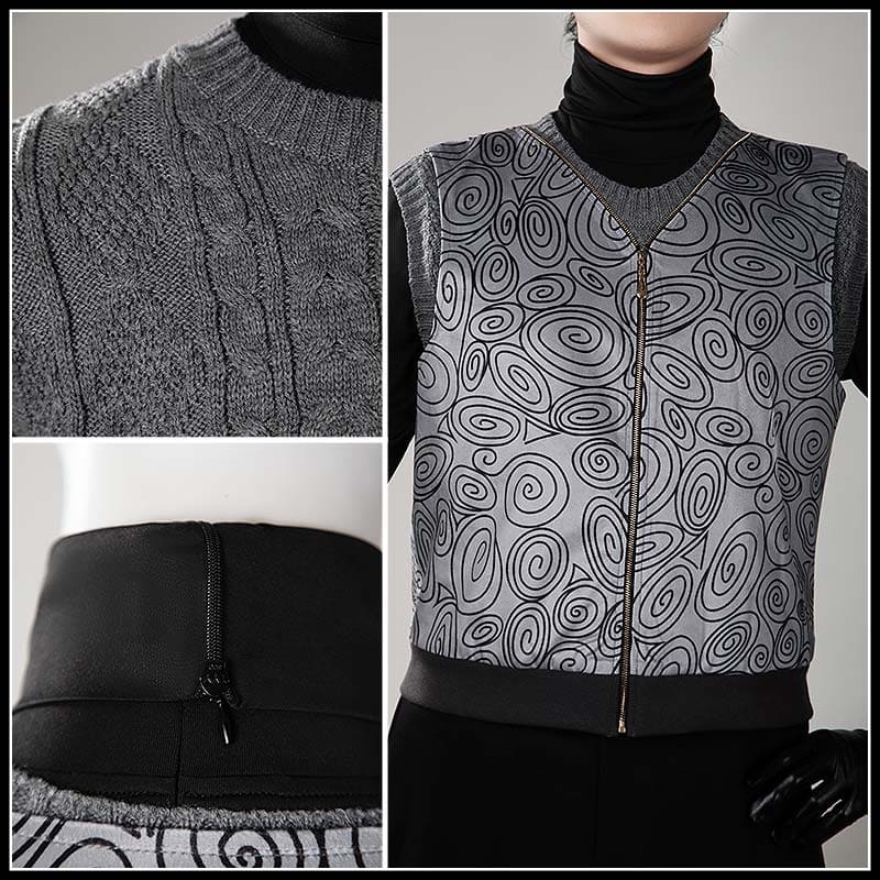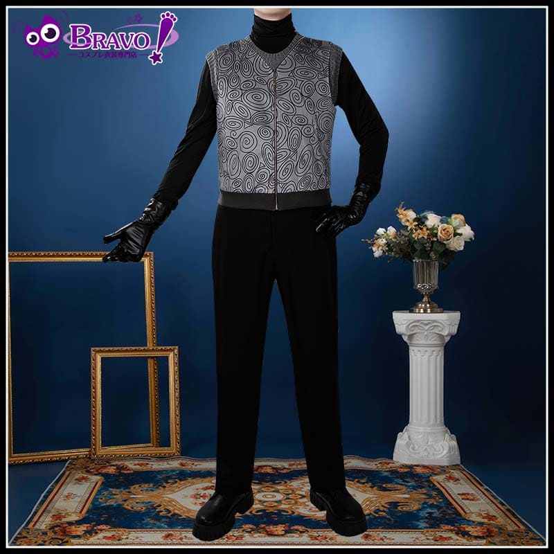 Vネックのベストにあしらわれた白い渦巻き刺繍は、コートの柄と高度に統一感があり、全体のシルエットとキャラクターの識別性を高めています。ジッパー仕様で実用的、かつボディラインに沿ったカッティングです。