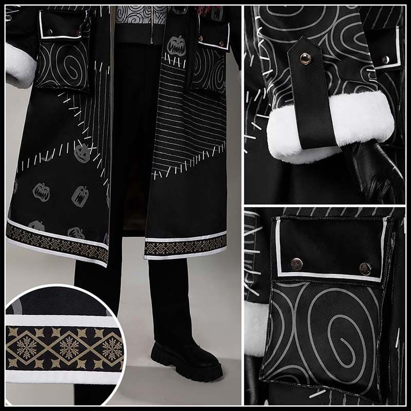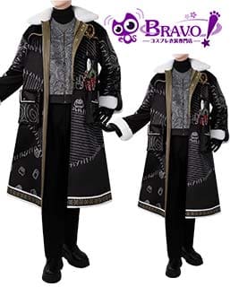 黒色のロングコートは生地がハリとコシがあります。全体に施された印染めの加工が、「縫い目の跡」、「渦巻き」、「不規則な幾何学図形」を完璧に再現しており、キャラクターを生き生きと再現しています。襟元、袖口、裾の白い人工毛皮は均一でボリュームがあり、温かみのある冬の感触と華やかなレイヤード感をプラス。袖口の紐留め、内側のカーキ色の綿布裏地など、細部の処理も非常に丁寧です。